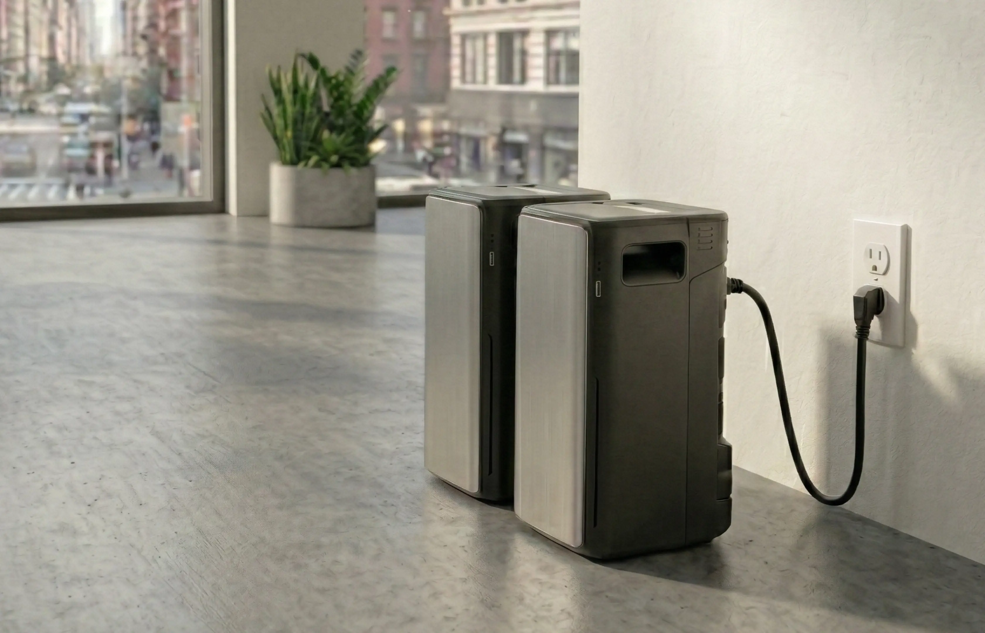 The plug-in batteries are roughly the size of a large toaster oven. Each battery weighs about 50 pounds.